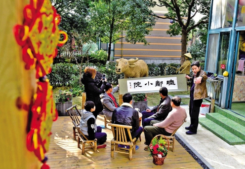 1月25日中午,嘉興秀洲區(qū)春曉源居民田舍郎家前的“睦鄰小院”里,鄰居和客人們一邊喝茶聊天,一邊欣賞書法作品,其樂融融。這個新完工的“睦鄰小院”是小區(qū)居民的露天“議事廳”。今年年初,田先生又將秀洲農(nóng)民畫公司創(chuàng)作的稻草“組雕”——“大水?!闭堖M院子,使得小院既具田園氣息,又有了濃濃的年味。(李劍銘 攝)