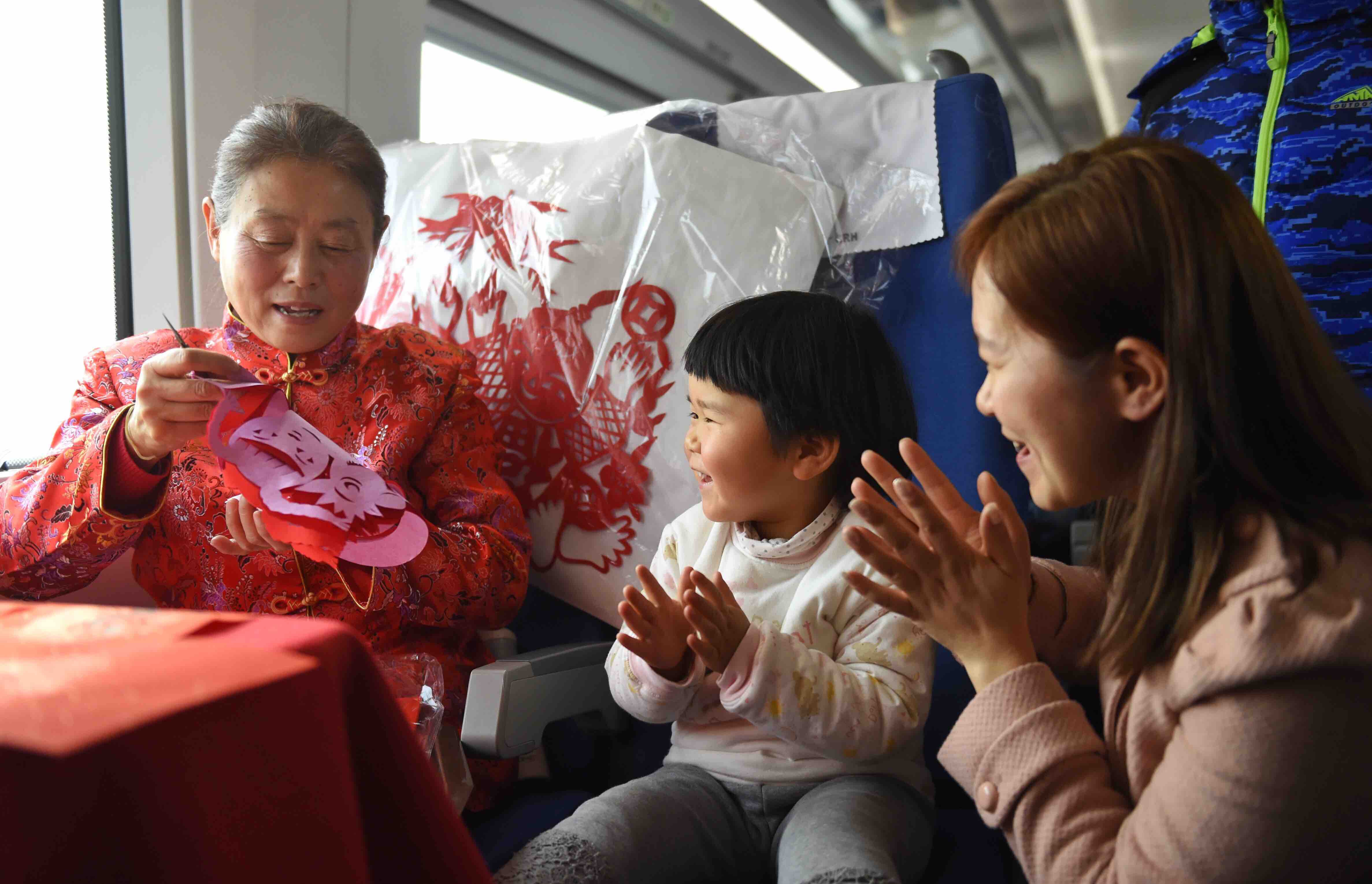 1月25日,在C6304次列車上,非遺剪紙傳承人史芹芳(左)為旅客剪出“福雞”。當日,成都鐵路局成都客運段在成都東開往江油的C6304次列車上開展“新春迎新會”。迎新會上邀請到的成都市非遺剪紙傳承人為旅客現場剪出“福雞”“?!弊?,書法家給旅客送出新春對聯,乘務員還為旅客帶來了舞蹈表演,車廂內洋溢著一片歡快的節日氣氛。(劉坤 攝)