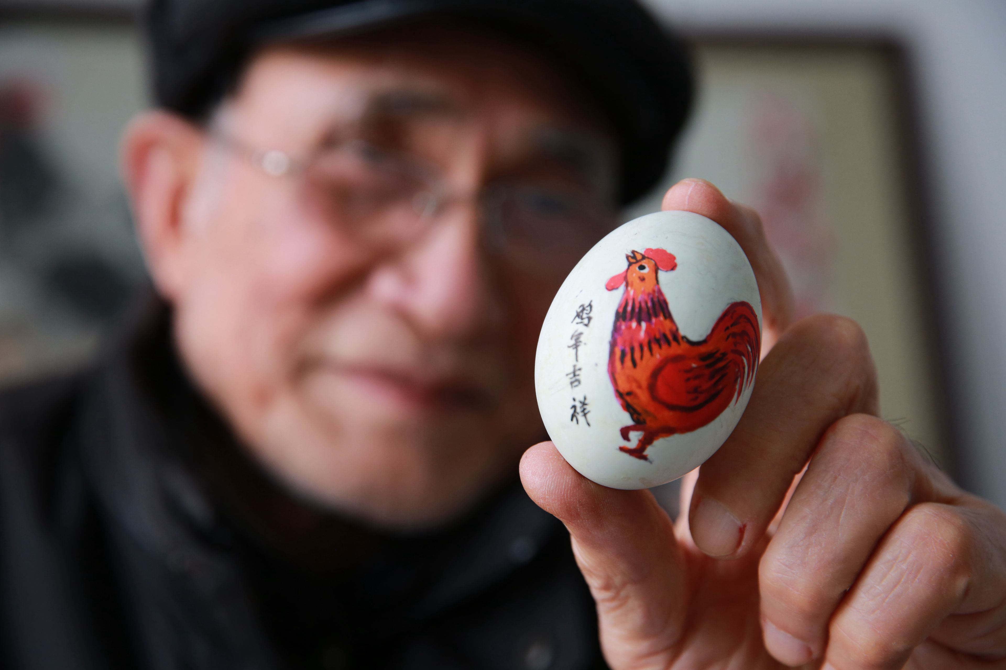余姚八旬翁妙手繪就蛋殼雞