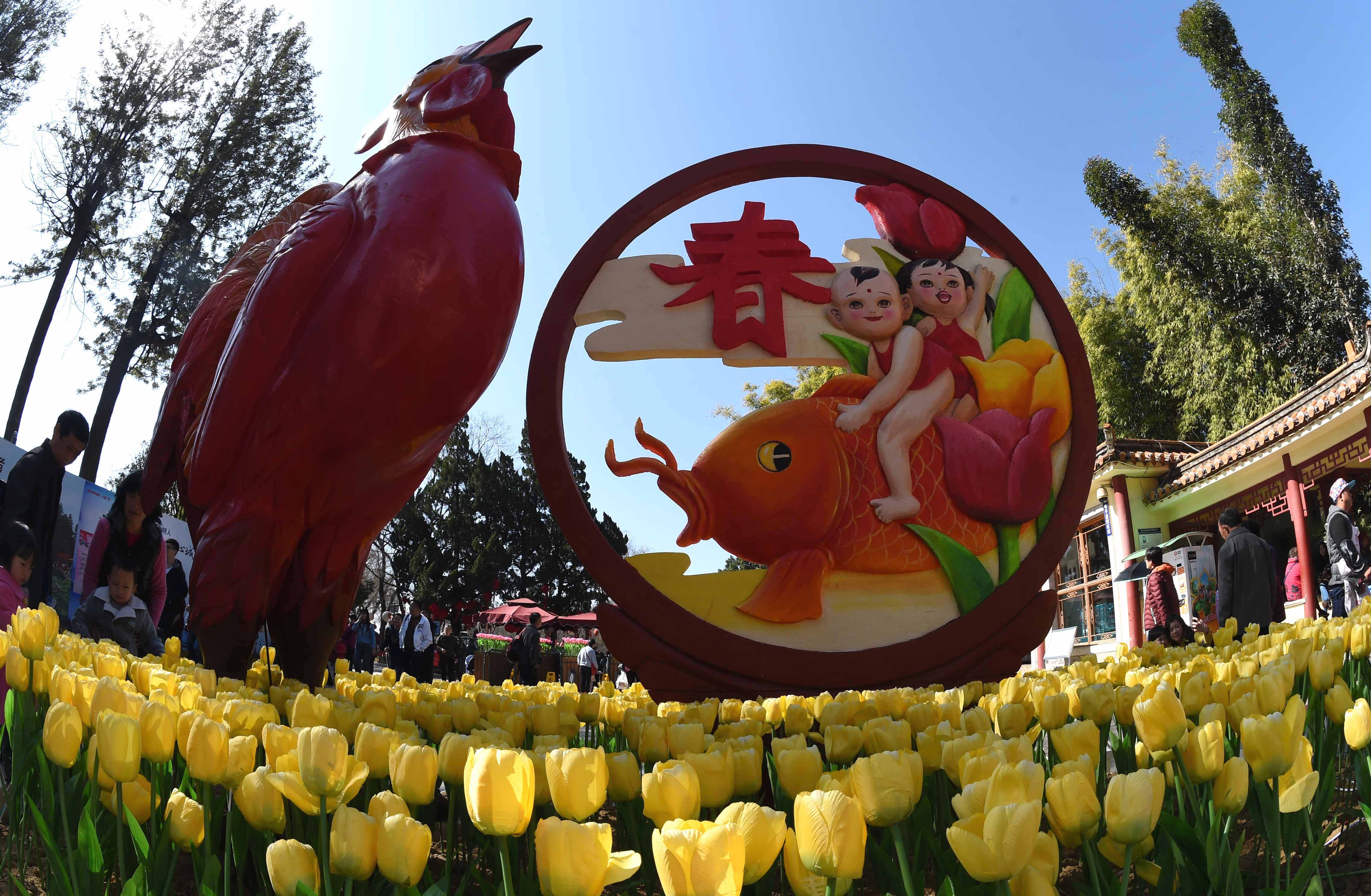 2月5日,游人在云南省昆明市大觀公園里觀賞盛開的郁金香和“雞年迎春”造型。(藺以光 攝)