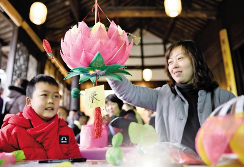 2月8日下午,海鹽縣沈蕩鎮舉辦元宵花燈制作親子活動。一盞荷花盛開的“廉”燈,讓人稱贊。(徐志達 攝)