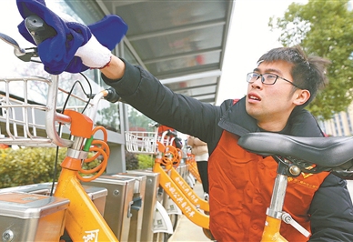 2月21日,余姚城區的10余名黨員、團員和青年志愿者利用午休時間,開展“我為城市洗把臉”公益環保行動,他們對馬路兩邊的公交候車亭、垃圾箱、公共自行車進行了仔細清洗,并打掃了周邊綠化帶。(吳大慶 徐文杰 攝)