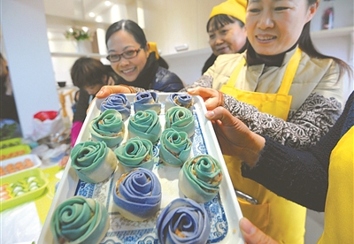 三八節(jié)即將來(lái)臨,3月1日,寧波鄞州白鶴街道企業(yè)婦代會(huì)的成員在紫鵑社區(qū)舉行“展風(fēng)采,秀廚藝”活動(dòng),她們用各色蔬菜汁和面,包制出形狀、顏色各異的精美面食,其中一組“藍(lán)色妖姬”花樣饅頭最搶人眼球。(丁安 忻蓉 攝)