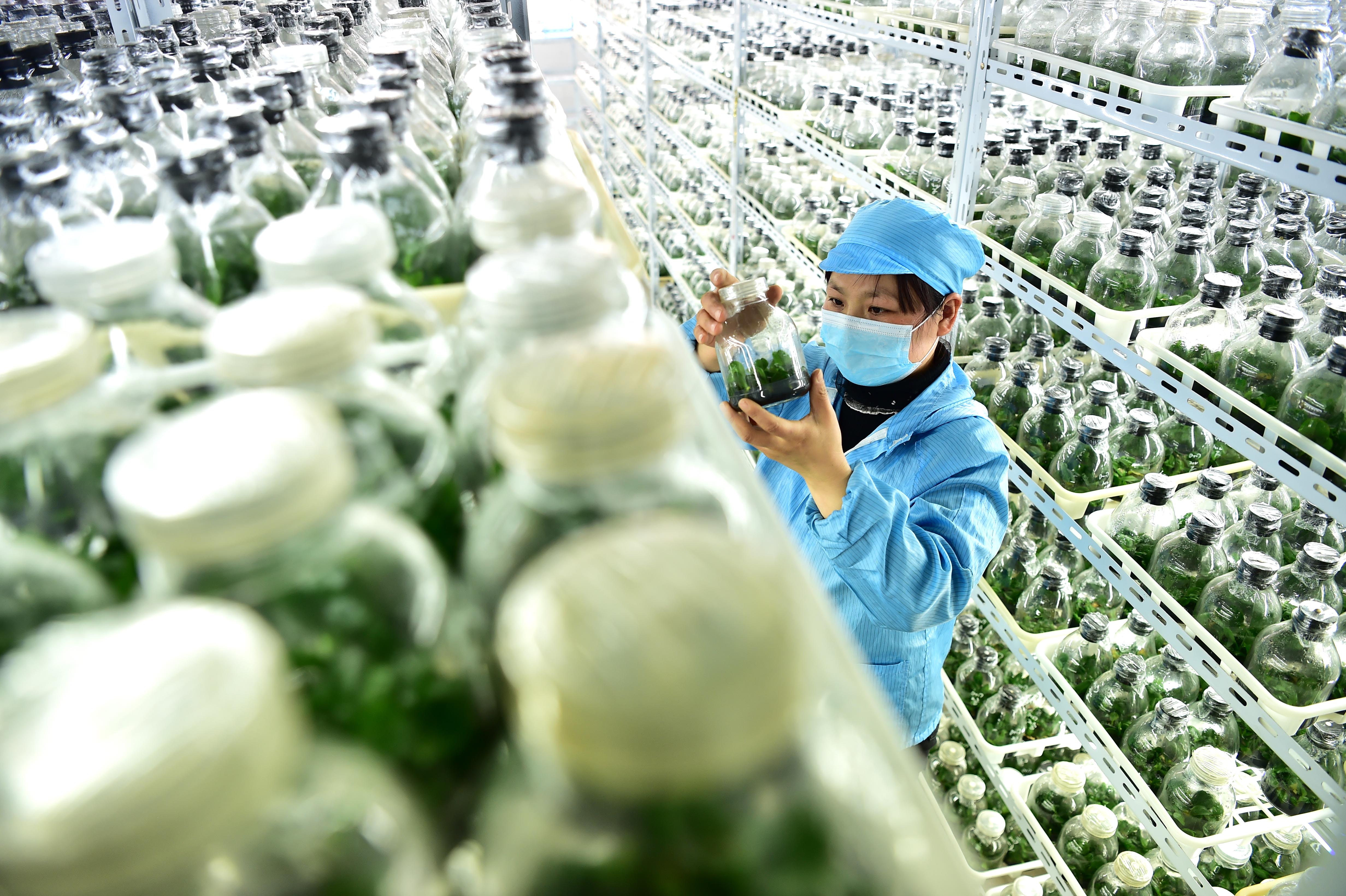 3月2日,技術(shù)人員在安徽省肥西縣上派鎮(zhèn)蘭君園藝花卉種植基地檢查蝴蝶蘭幼苗生長(zhǎng)情況。