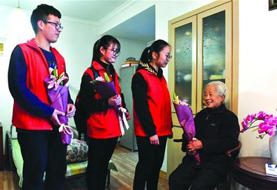 3月7日,湖州師院外國語學院的志愿者來到湖州飛英街道墻壕里社區,為該社區70歲以上的老年婦女送去鮮花,表達對她們的祝福之情。(江云開 攝)