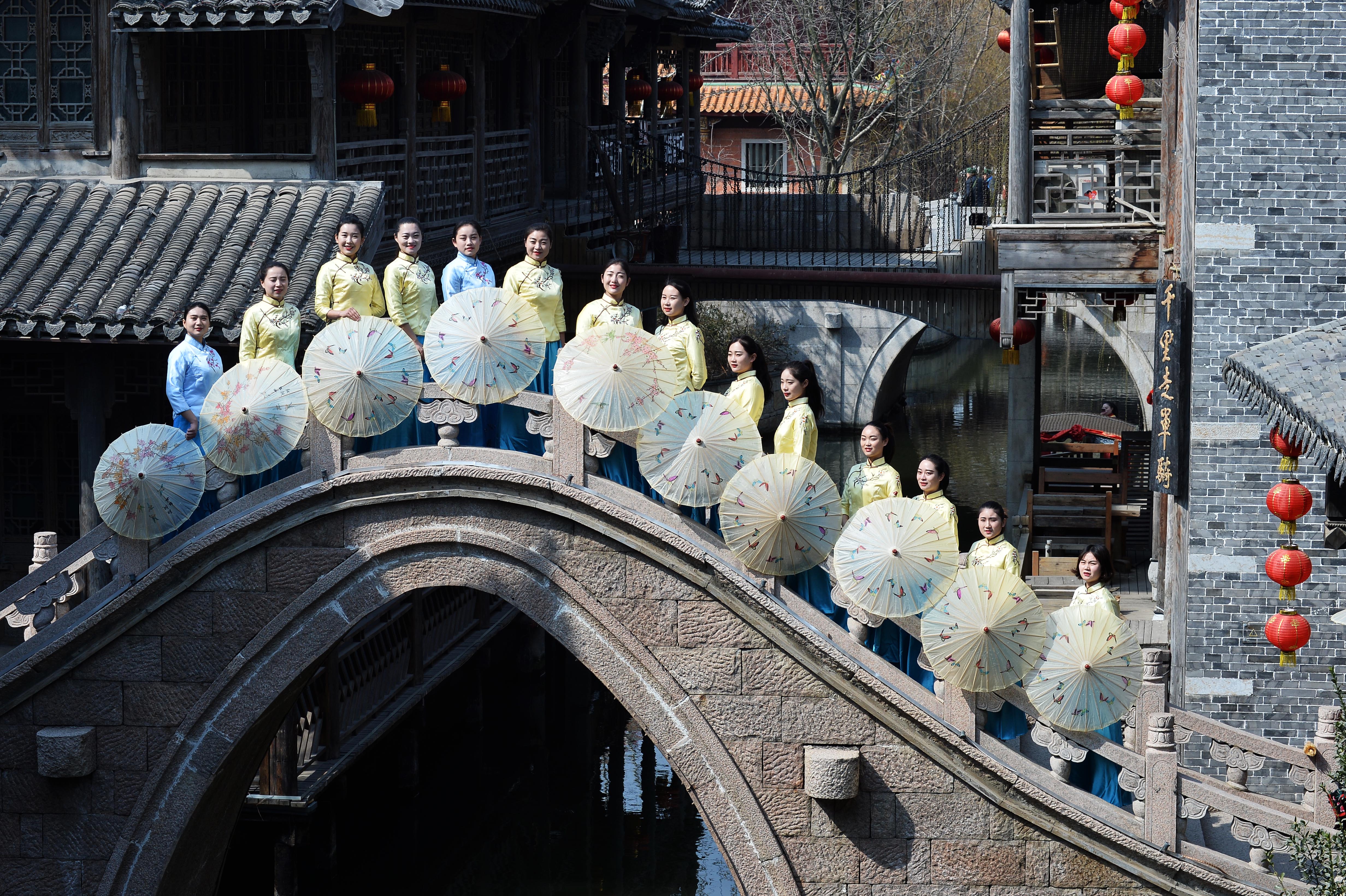 3月7日,在山東省棗莊市臺兒莊古城,景區(qū)女職工們參加水鄉(xiāng)服飾秀。