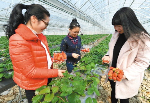 日前,幾位婦女在自由采摘草莓。今年,臺(tái)州三門高漢果蔬專業(yè)合作社利用鋼架溫室大棚高架種植了50多畝莊姬、紅顏、越心等草莓,采用無土栽培技術(shù),實(shí)行現(xiàn)代化、智能化、自動(dòng)化管控,通過精心培育,草莓獲得大豐收。他們培育的草莓采摘期長,可從1月采摘到5月,預(yù)計(jì)畝產(chǎn)量達(dá)到3000多公斤,畝產(chǎn)值15萬元以上。(朱曙光 陳維連 攝)