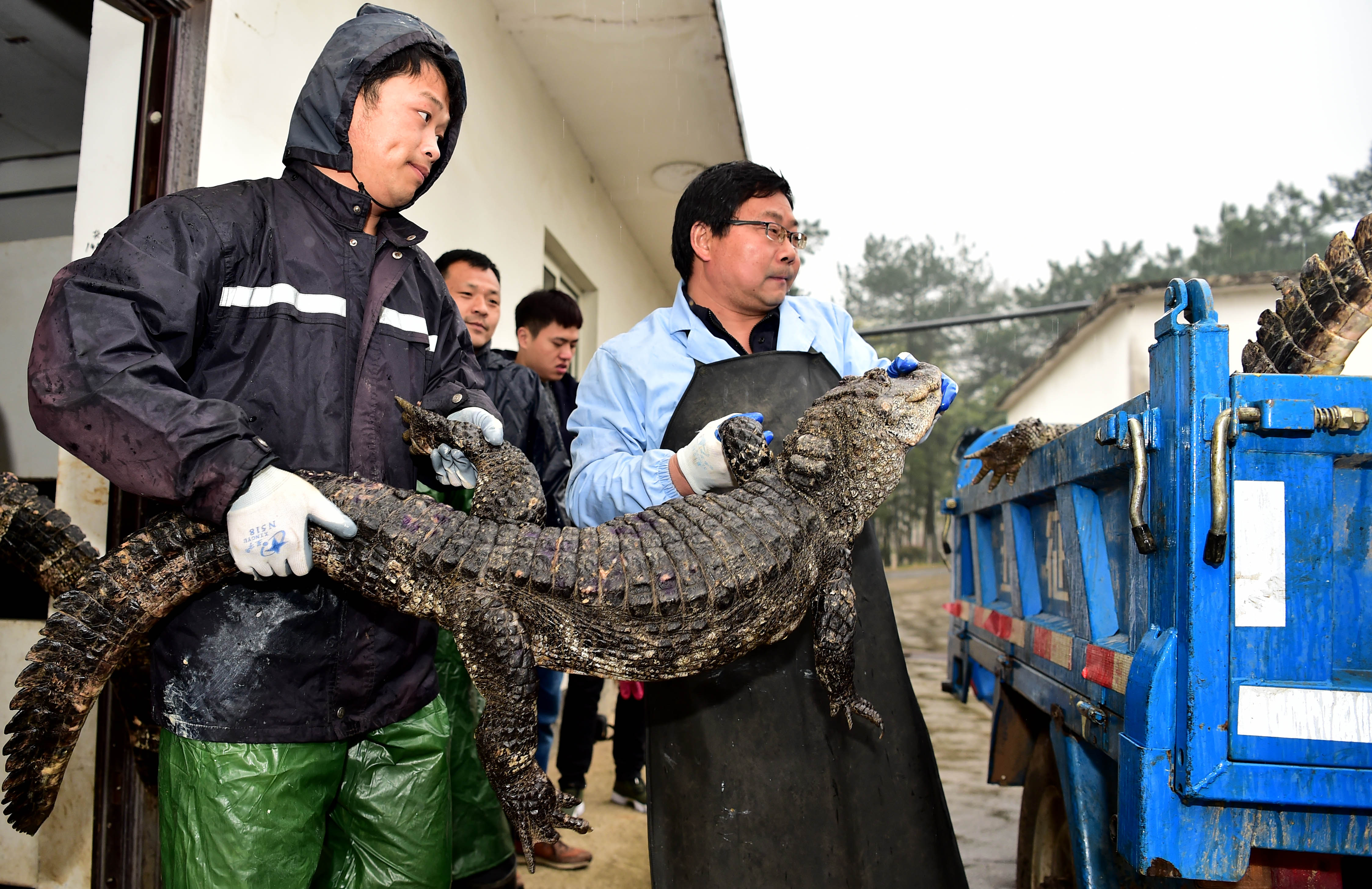 3月19日,工作人員將結束休眠的揚子鱷從室內暖房搬出準備運往養殖池。隨著連日來氣溫回升轉暖,位于安徽宣城的揚子鱷國家級保護區里又開始熱鬧起來。經過四個多月暖房內的“貓冬”休眠,這里的一萬三千多條揚子鱷又將分批來到室外,享受春日的溫暖陽光。(劉軍喜 攝)