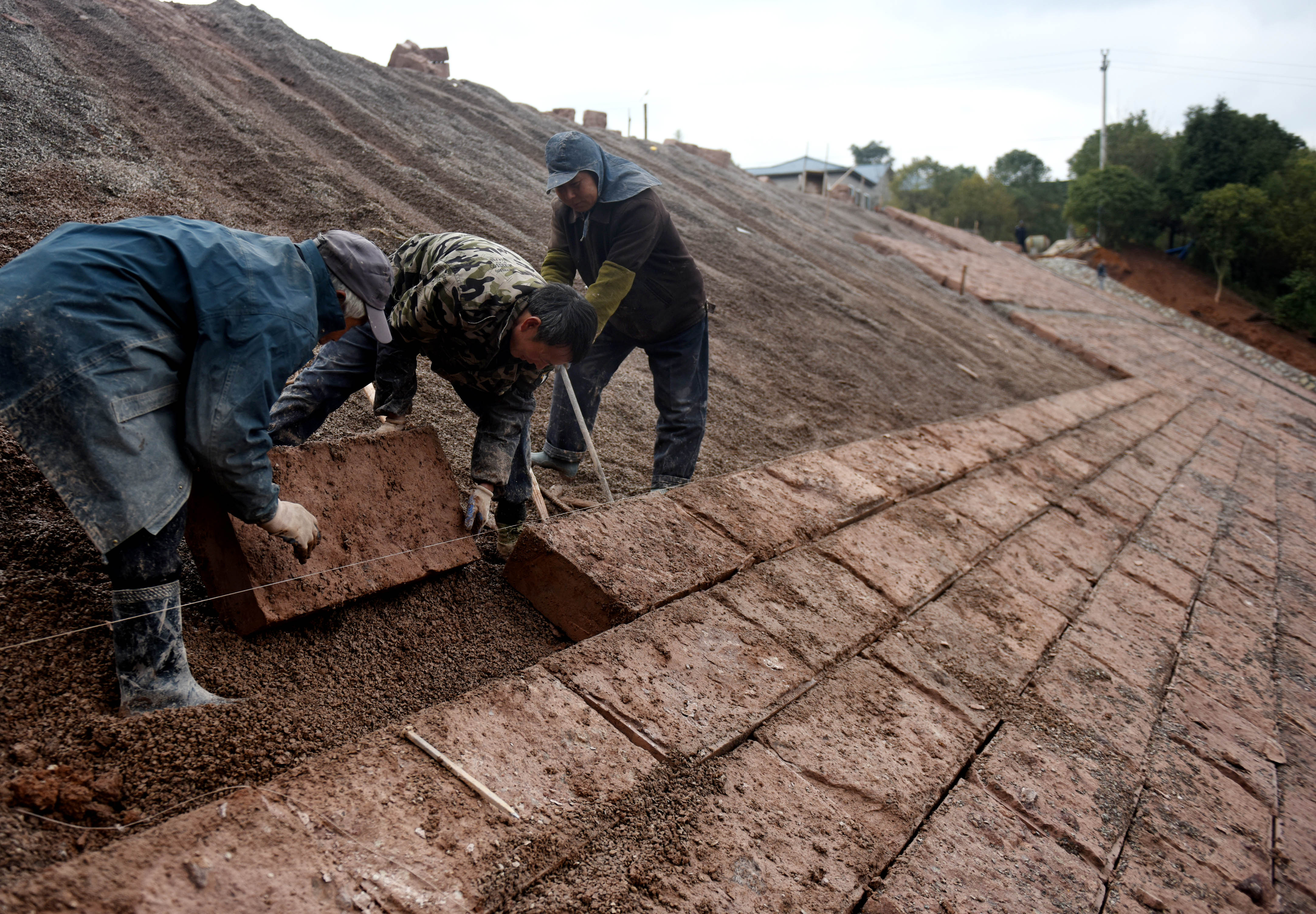 浙江黨建網訊3月21日,施工人員在武義縣俞源鄉下楊村水垅水庫大壩用條石鋪設壩面,確保安全度汛。(張建成 攝)