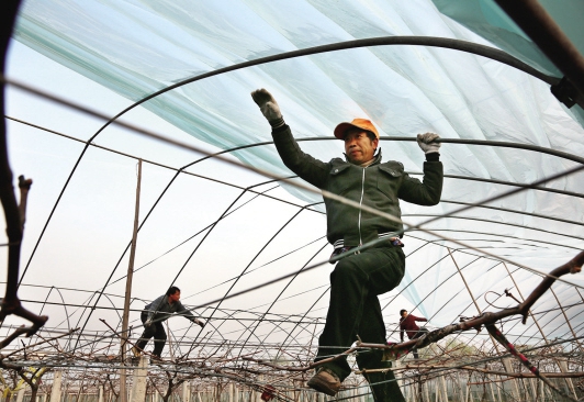 3月21日一大早,浦江縣浦南街道橋頭村、吳郎中村等村莊的村民們?cè)谄咸烟锢锩χw薄膜。近年來(lái),該街道不斷調(diào)整優(yōu)化產(chǎn)業(yè)結(jié)構(gòu),因勢(shì)利導(dǎo)引導(dǎo)廣大農(nóng)戶大力發(fā)展葡萄產(chǎn)業(yè),并將其列入縣農(nóng)業(yè)發(fā)展專項(xiàng)資金的扶持對(duì)象。(沈建中 繆小芬 攝)