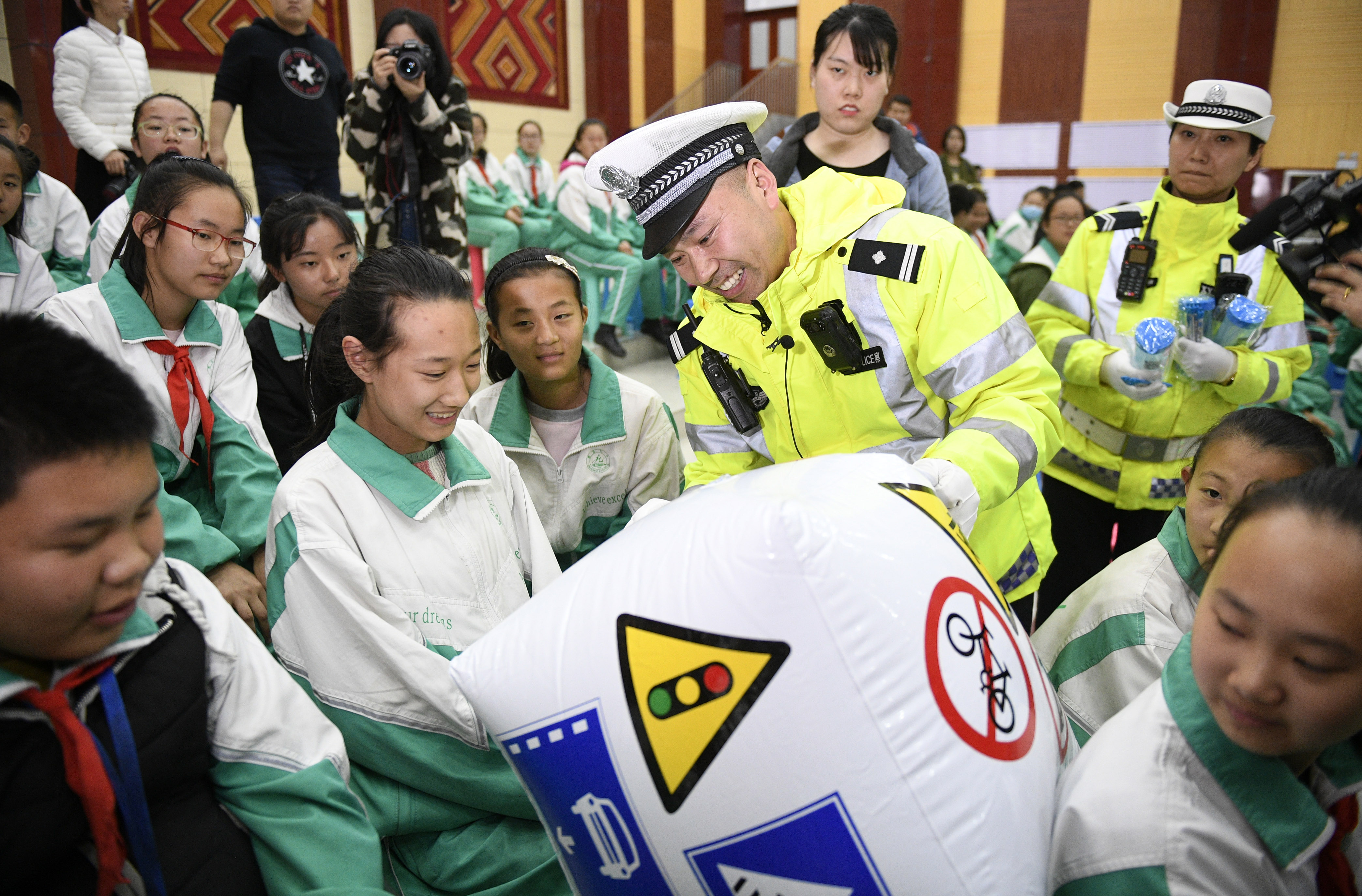 3月21日,寧夏銀川市金鳳區交警一大隊民警向學生講解交通安全標志。當日,為迎接3月27日第22個全國中小學生安全教育日,銀川市金鳳區交警一大隊民警走進銀川九中閱海分校,為學生們帶來一堂生動的交通安全課。交警現場為學生講解交通手勢和交通標志,以增強學生交通安全意識,提高自我保護能力。(王鵬 攝)