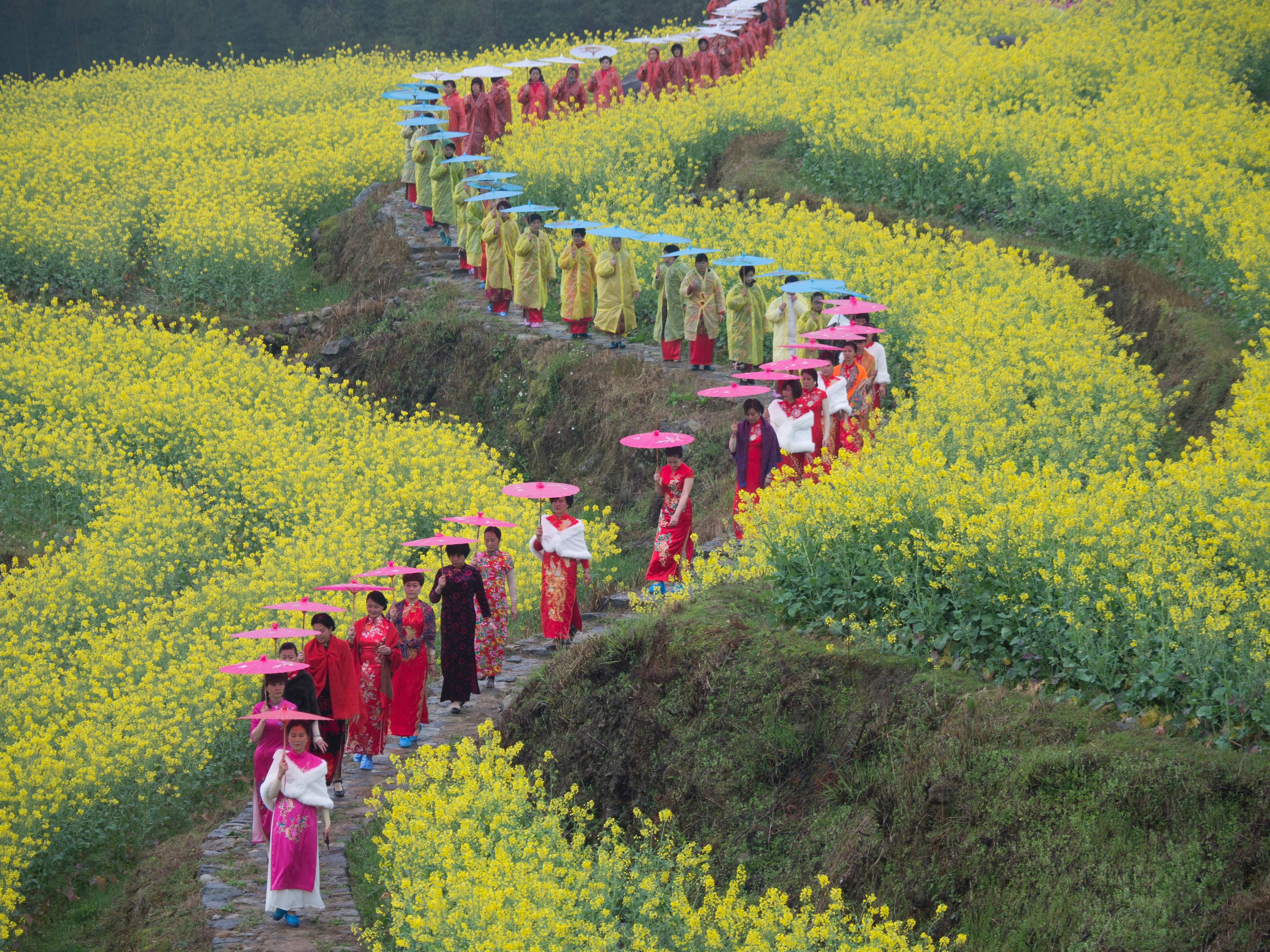 浙江黨建網訊3月22日,龍泉市塔石街道李山頭村的梯田油菜花海中,迎來了500多名旗袍愛好者,她們身著華美的旗袍,冒著淅瀝的春雨,邁著輕盈的步伐,漫步在金黃的油菜花田之中,一展中國女性獨有的旗袍服飾文化的獨特魅力。(李肅人 攝)