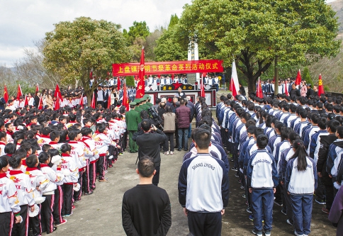 3月23日上午,臨海市上盤鎮烈士陵園莊嚴肅穆,臺州市、臨海市及上盤鎮關工委聯合舉辦清明祭奠革命烈士活動,三級關工委人員及當地鎮機關、派出所、中小學、各村1600多人參加了祭奠活動。(翁一清 攝)