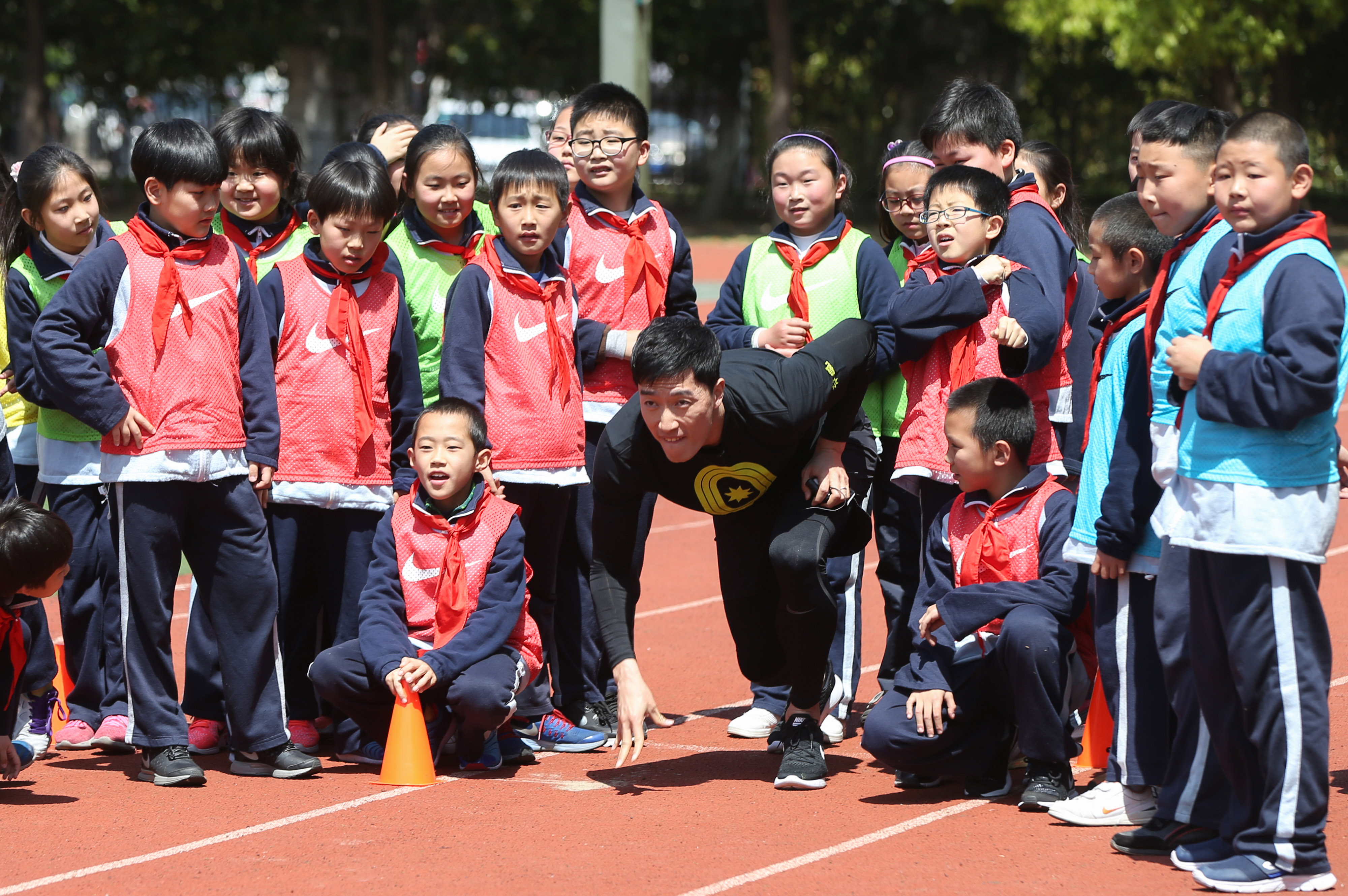 4月13日,劉翔在活動中做示范。當日,劉翔來到上海師范大學康城實驗小學,作為“活力校園”的特別教練給孩子們帶來了一堂別開生面的跑步課。2016年9月至今,“活力校園”已覆蓋上海97所學校,其中跑步科目一共向上海37所學校提供了近千課時的課程,覆蓋學生近3萬人次。(丁汀 攝)
