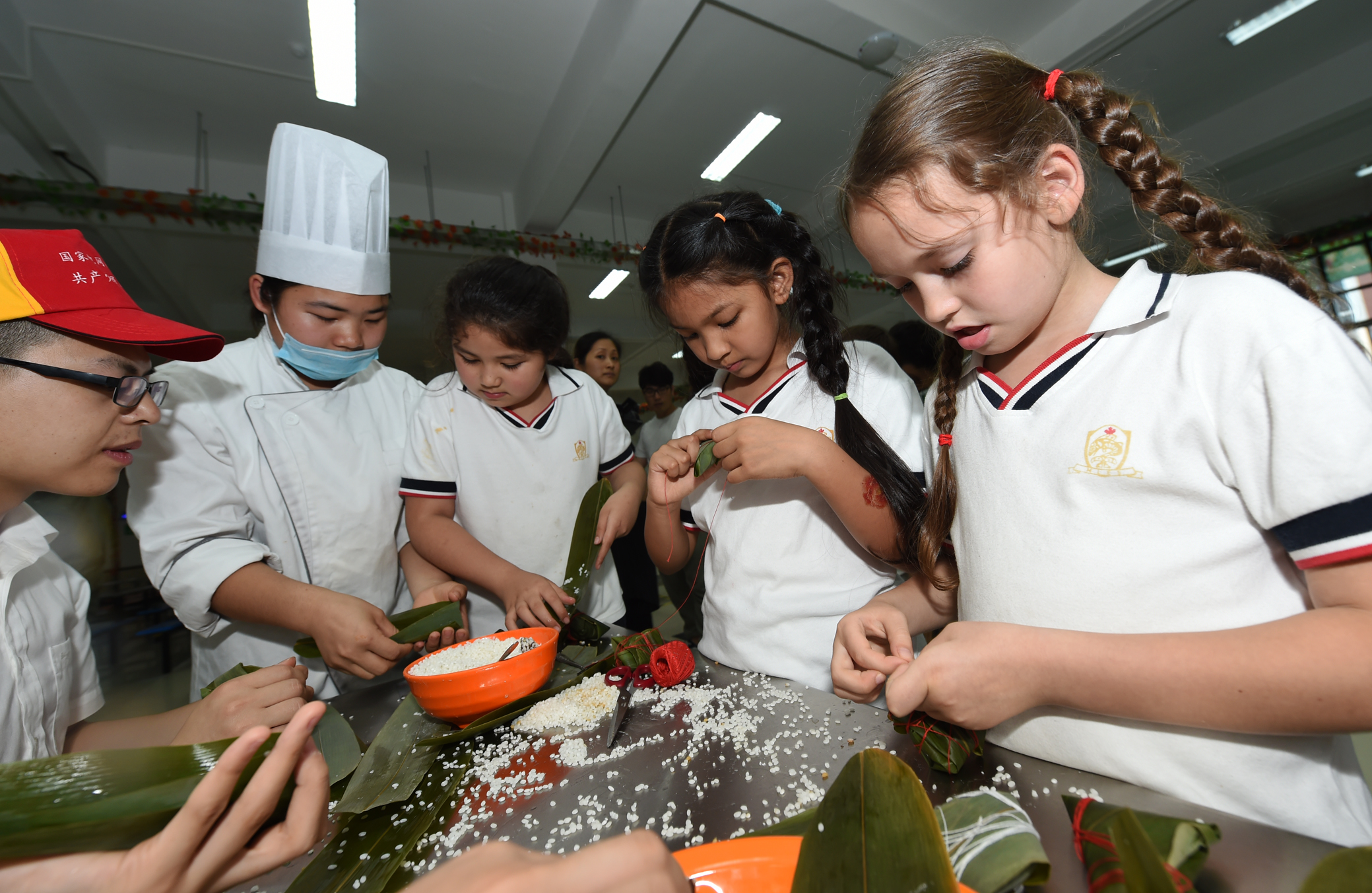 志愿者與中外小朋友包粽子