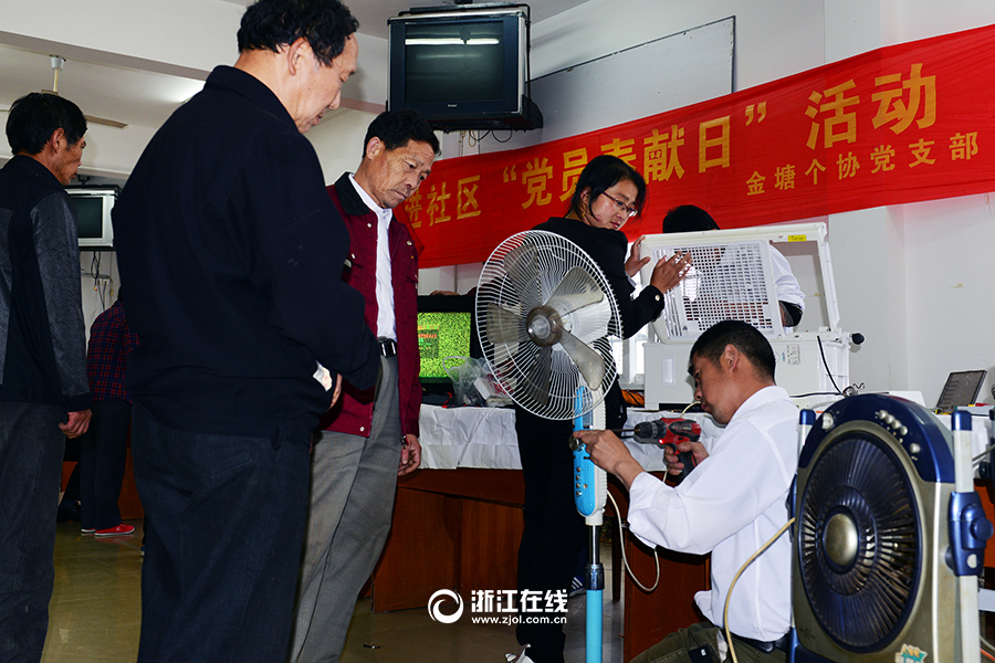 5月8日,舟山市定海區金塘鎮新豐社區禮堂內,村民正有序地等著修理電器。當天,舟山市金塘個體勞動者協會黨支部的黨員在新豐社區開展"黨員奉獻日”活動,踐行"兩學一做”學習教育,進行維修家用電器、配鑰匙、理發、修自行車、拍老年照等便民服務,深受群眾歡迎。據了解,金塘個體勞動者協會黨支部自2007年6月成立以來,已經32次走進社區,開展"黨員奉獻日”活動。