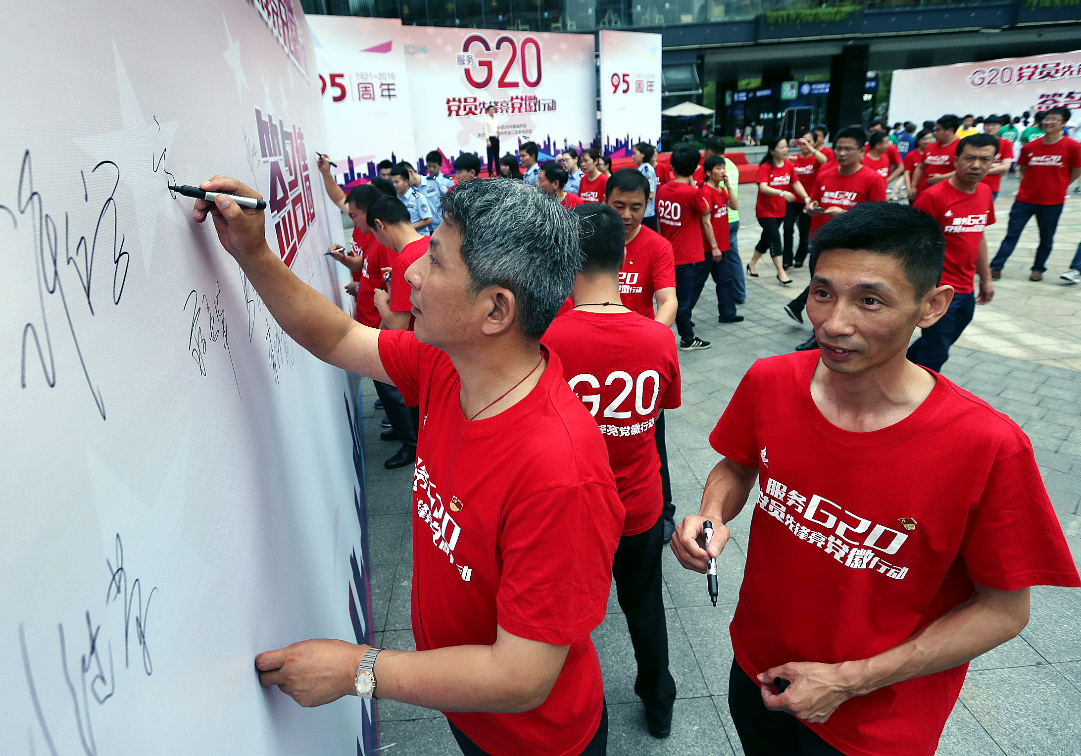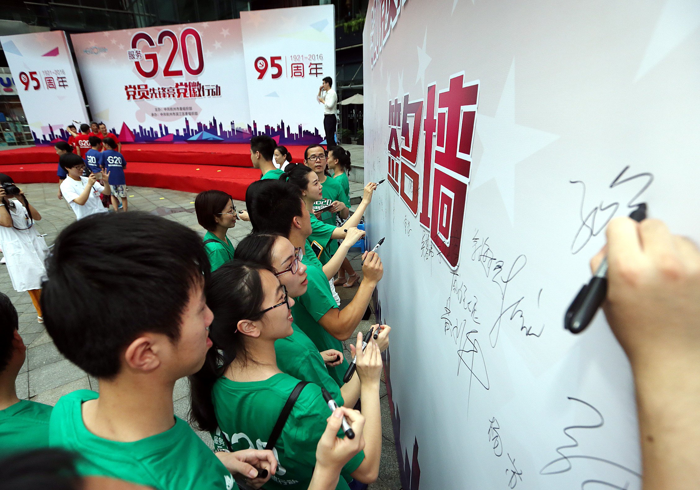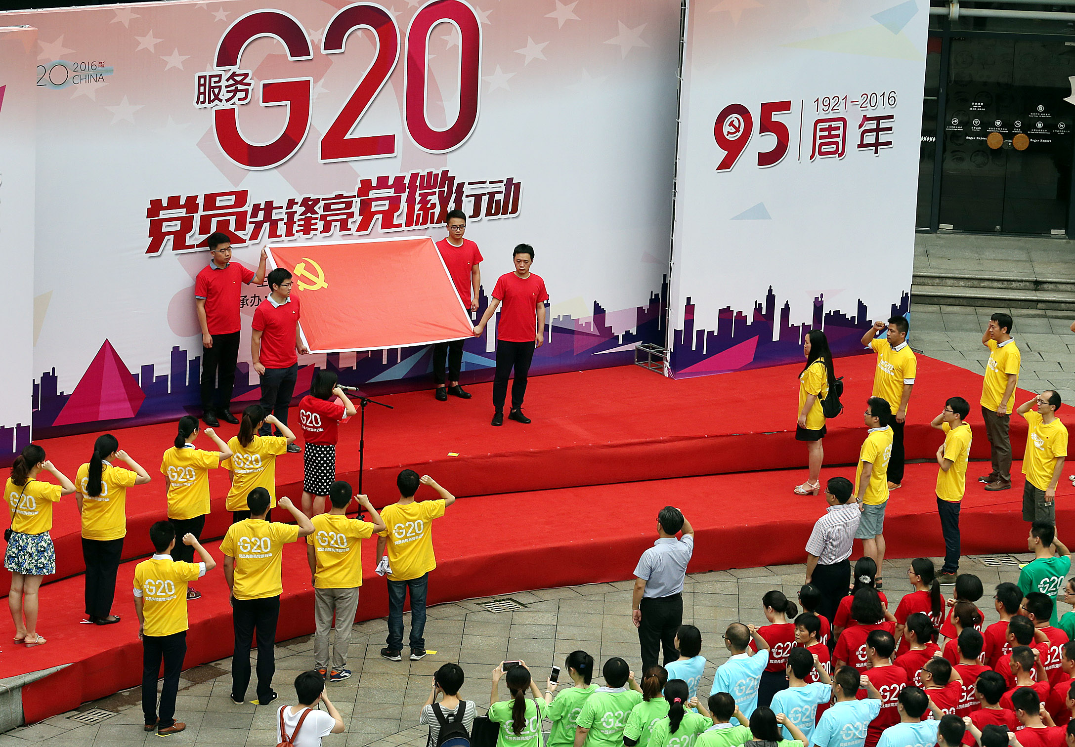 7月1日,杭州市委組織部主辦的“服務G20黨員先鋒亮黨徽”行動在濱江區星光大道廣場啟動。來自新發展黨員志愿者服務隊、街道機關志愿者服務隊、社區黨員志愿者服務隊等8支黨員隊伍,共300人參加了重溫入黨宣誓、現場為民服務等活動。