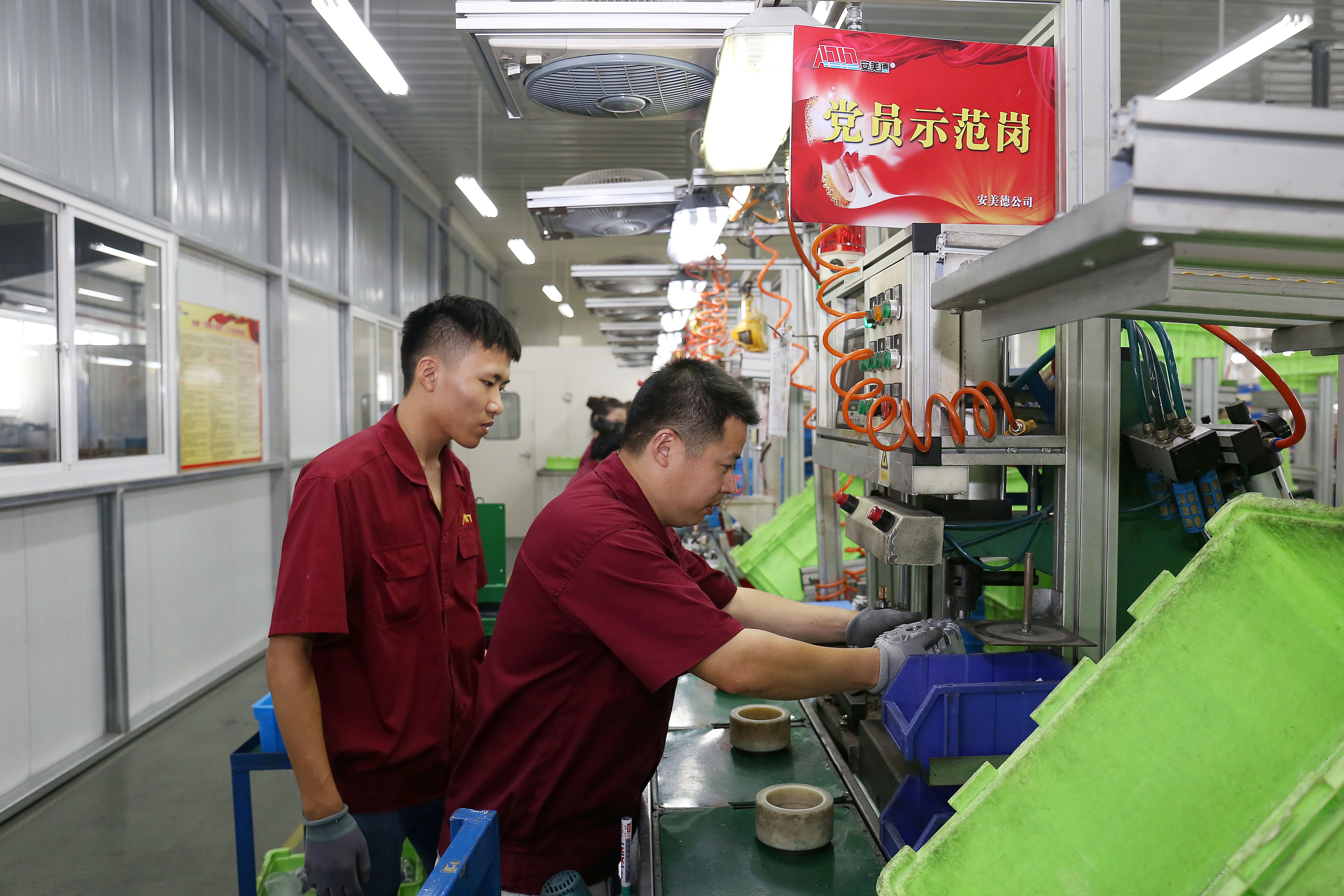浙江黨建網(wǎng)訊(浙江黨建網(wǎng)記者陸偉 通訊員 錢瑜 攝)7月19日,浙江安美德汽車配件有限公司總裝車間,黨員示范崗成員潘旭平正積極配合同事快速完成安裝工作。