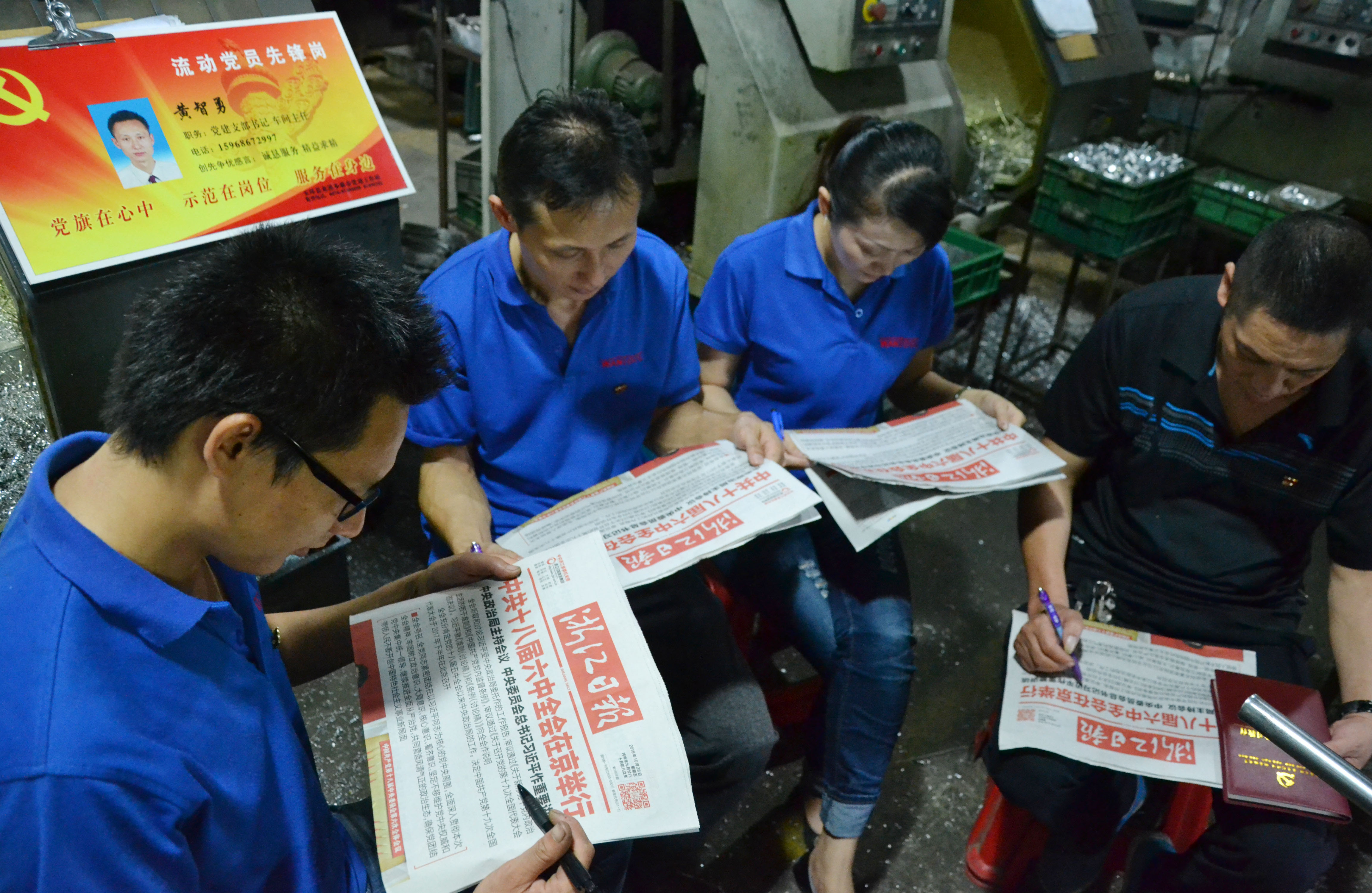 浙江黨建網(wǎng)訊近日,玉環(huán)縣龍溪鎮(zhèn)蘄春黨建工作站把刊登有黨的十八屆六中全會公報的《浙江日報》送到企業(yè)車間。利用午休時間,外來流動黨員正在學(xué)習(xí)六中全會精神。(詹智 攝)