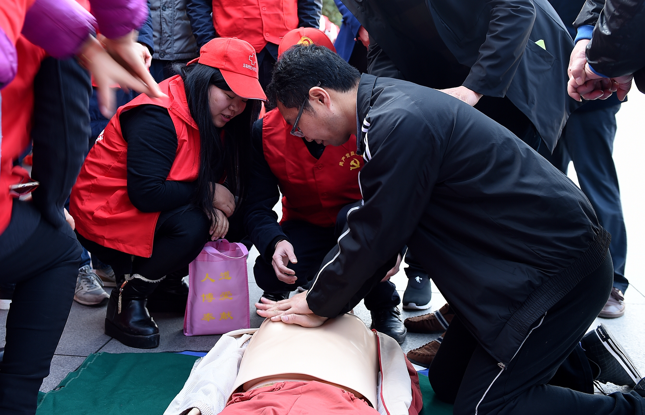 在活動中,志愿者們向社區居民宣講了外傷包扎、心肺復蘇等日常急救常識,講述了排除異物阻塞引起窒息的急救法,告訴居民怎樣撥打“120”電話及撥打急救電話后我該做些什么等,社區居民還紛紛上前體驗心肺復蘇過程。(龔獻明 攝)