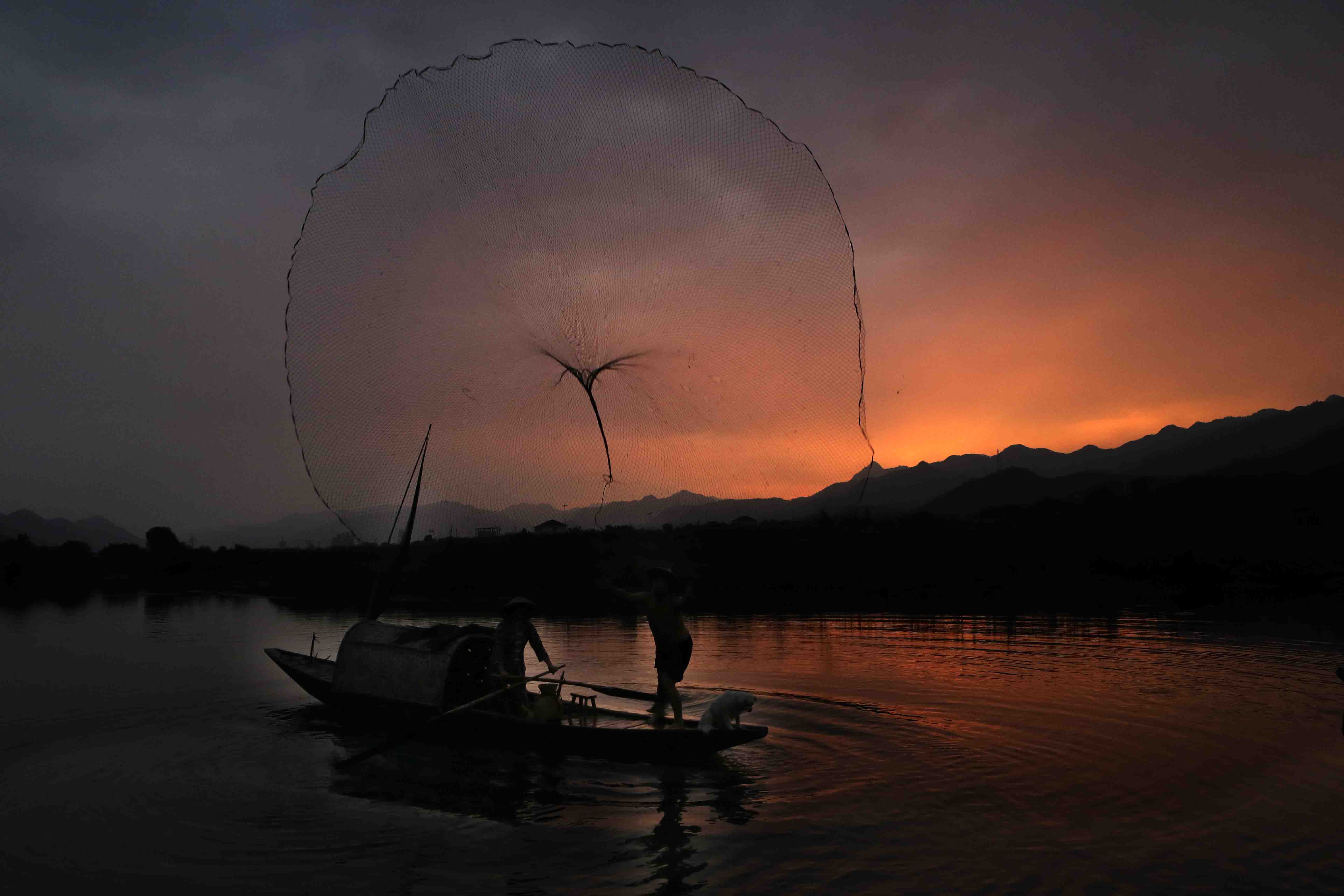 圖為晚霞美景與撒網“捕魚”的動人景象同現。
