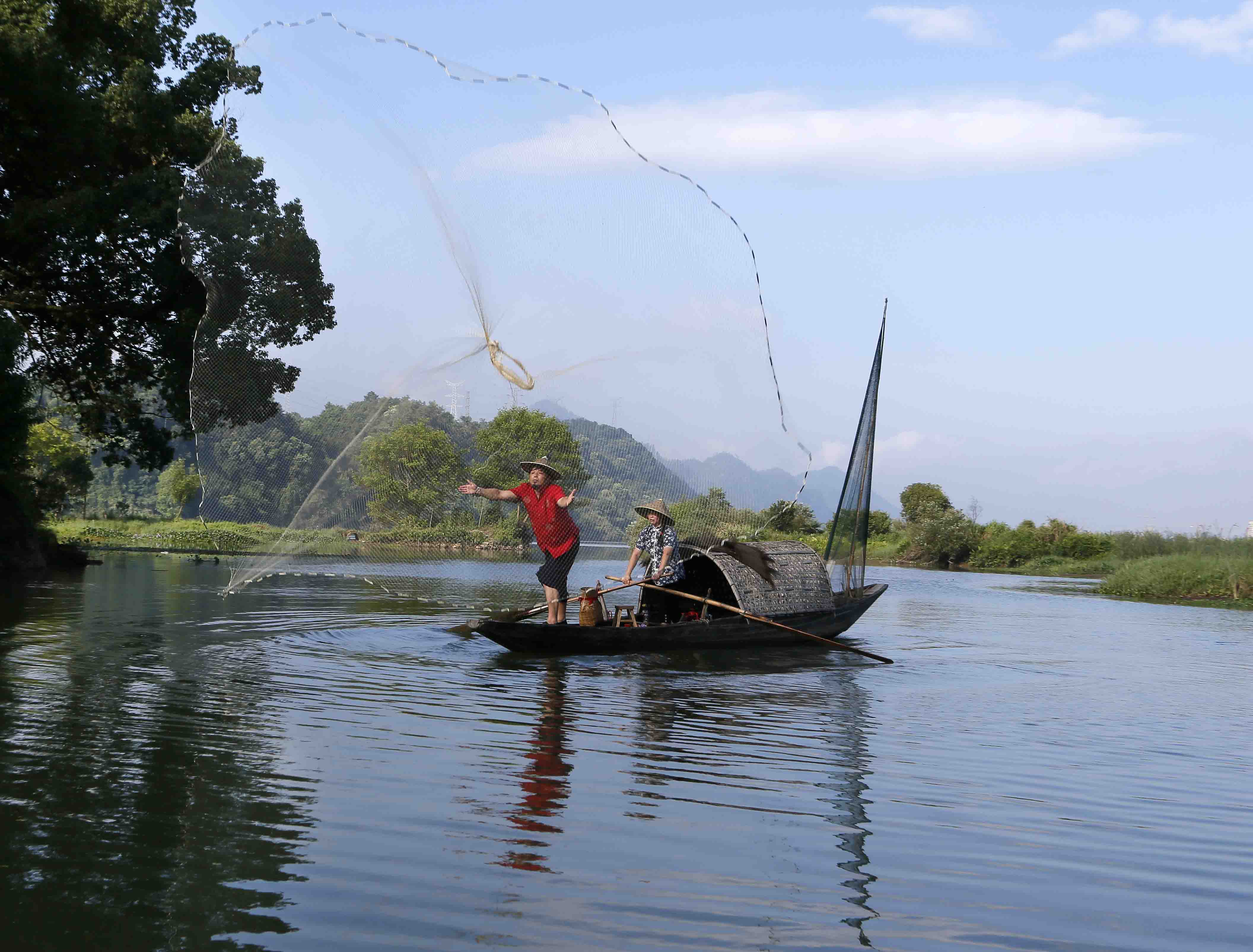 圖為藍天白云下的撒網“捕魚”圖也另有特色。