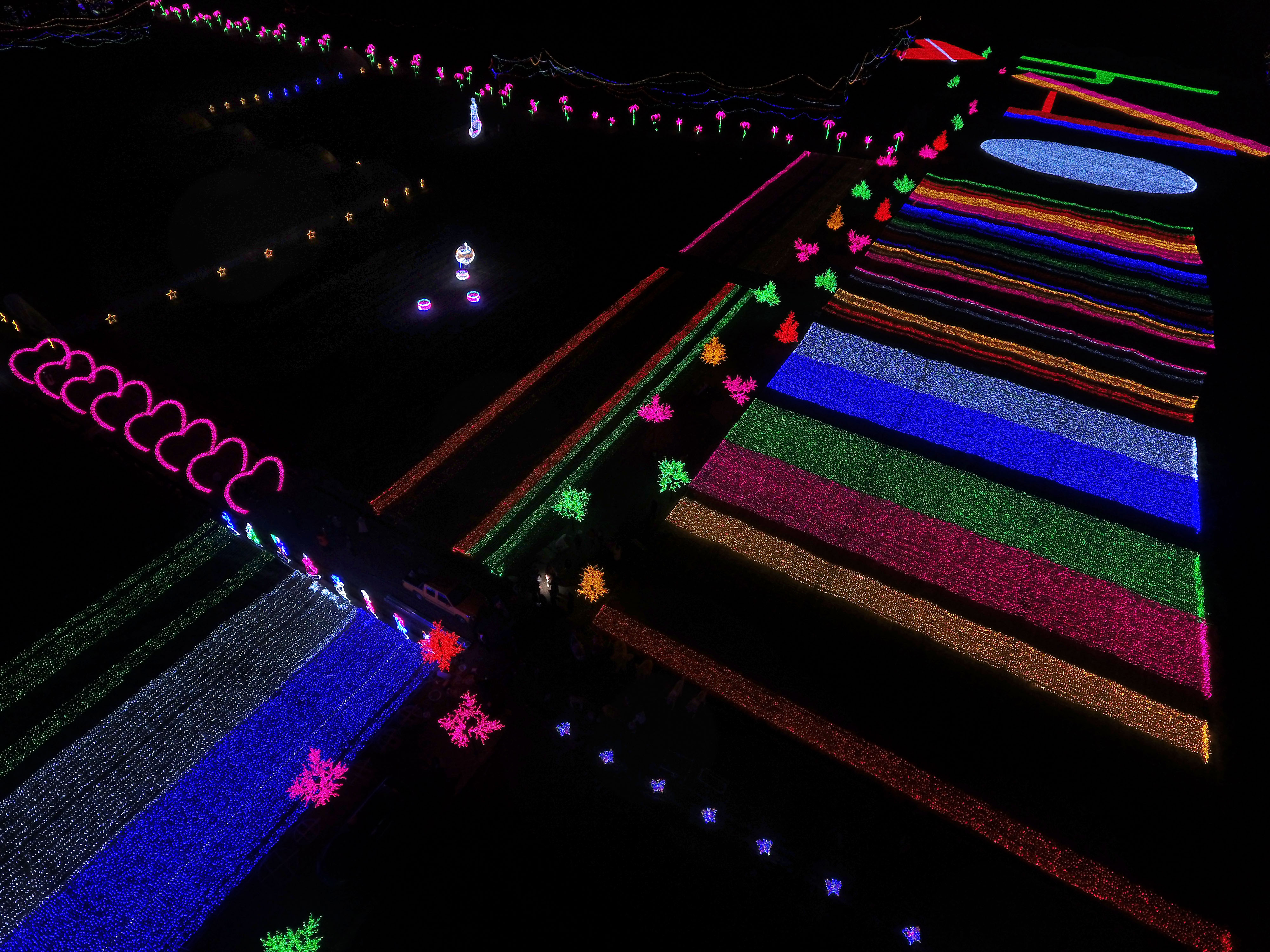 這里因武義、縉云、永康工業(yè)走廊開發(fā),1500人口的村莊吸引4000多外來人口租住。村里用液晶面板與LED矩陣光源組成絢麗雪山、心形通道、時光隧道、愛情之舟、大風(fēng)車、椰樹等造型。曠野燈海從12月24日正式開放后將持續(xù)到雞年元宵。(張建成 攝)