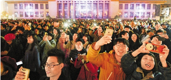 2017年1月1日零時,一群等待跨年的年輕人在杭州武林廣場歡呼“2017,歡迎你”,迎接新年的到來。記者 楊曉軒 錢璐斌 陳嘉昀 攝
