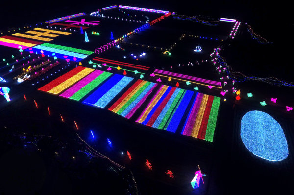 2016年12月30日晚,游客徜徉在武義縣王山頭村流光溢彩的曠野燈海,滿懷豪情喜迎新年的到來。 張建成 攝