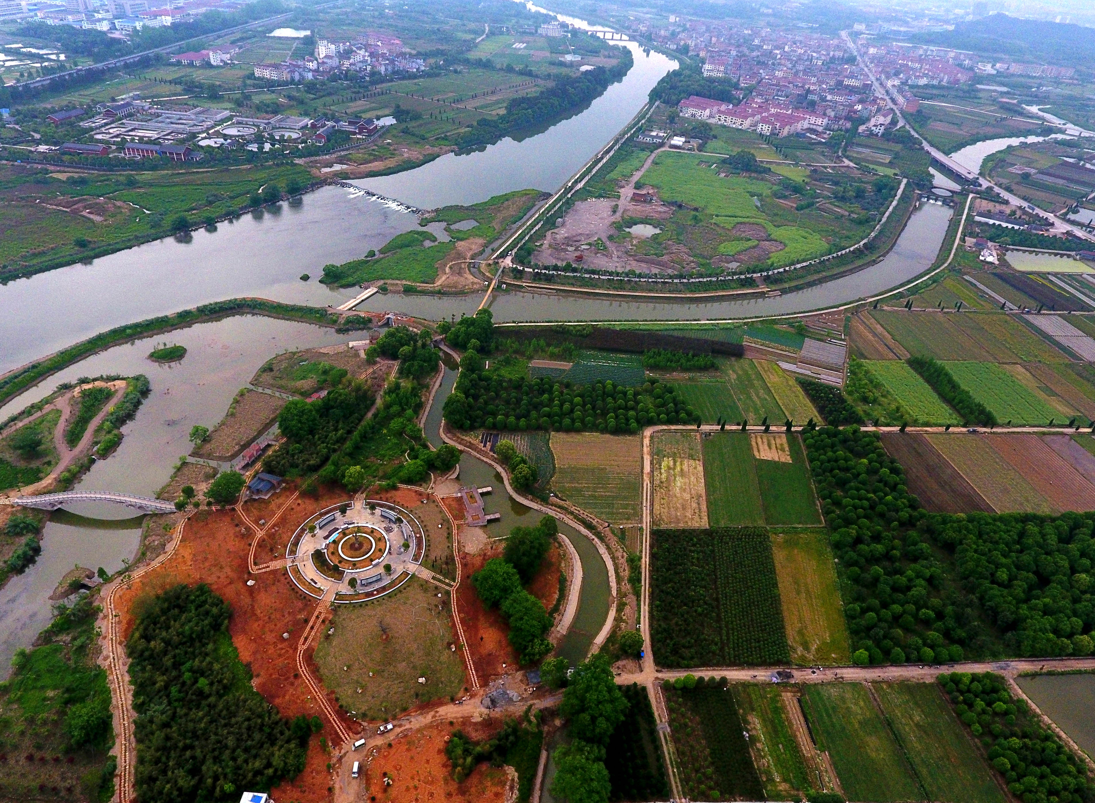 在“五水共治”中,武義縣位于武義江與白鷺溪交匯處的履坦鎮(zhèn)履三村與壇頭村,聯(lián)手建設(shè)1000多畝的生態(tài)濕地公園,合力打造最美河道。據(jù)悉,該生態(tài)濕地公園將從“五一”起對游客開放。圖為俯瞰濕地公園,小橋流水、草木蔥翠,滿眼生機(jī)。(張建成 攝)