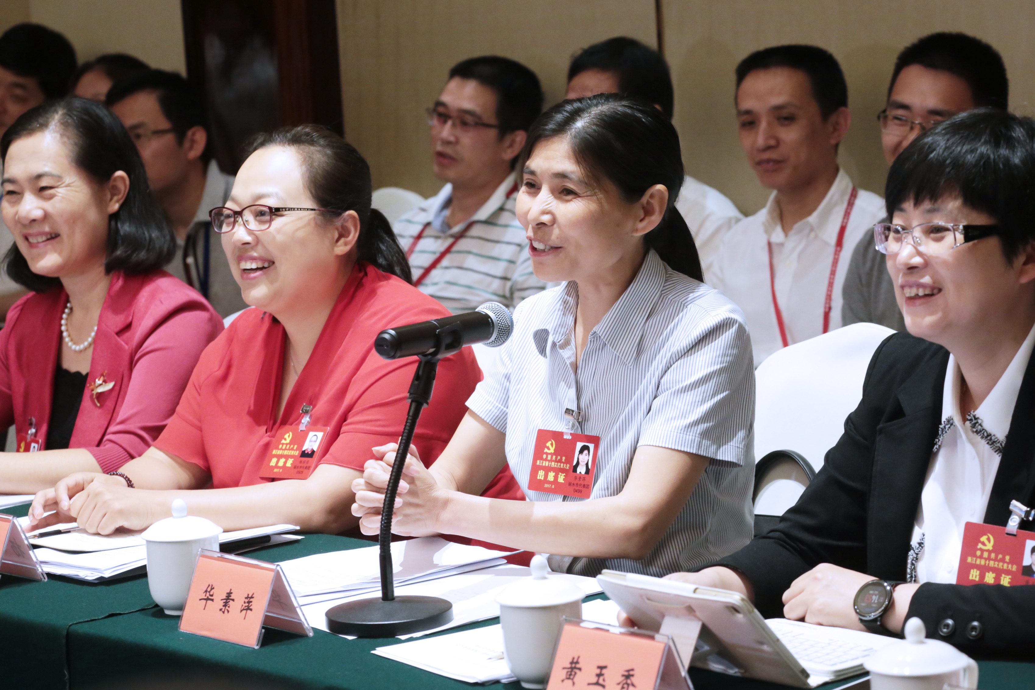 6月12日,出席中國共產黨浙江省第十四次代表大會的各代表團代表在各自駐地認真審議省黨代會報告。圖為麗水代表團的華素萍代表就農村發展提出建議。(浙江日報記者 吳煌 王堅穎 攝)