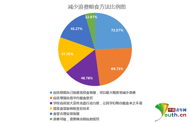 在“如何減少食物浪費”問題上,多數學生表示,可以通過多種形式來宣傳節約精神、減少食物浪費。根據中國青年網調查,有72.57%的學生認為“應該根據自己飯量選擇食物量,可以最大限度地減少浪費”,有69.73%的學生認為“應該增強自我節約糧食意識”,有48.78%的學生認為“學校應該加大宣傳光盤行動力度,讓同學們明白糧食來之不易”。