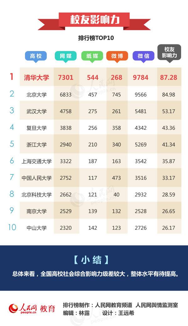 通過數據分析后,北京大學、清華大學、武漢大學、浙江大學、復旦大學、上海交通大學、中南大學、中國人民大學南京大學、四川大學分別位居中國高校社會影響力排行榜的前十名。