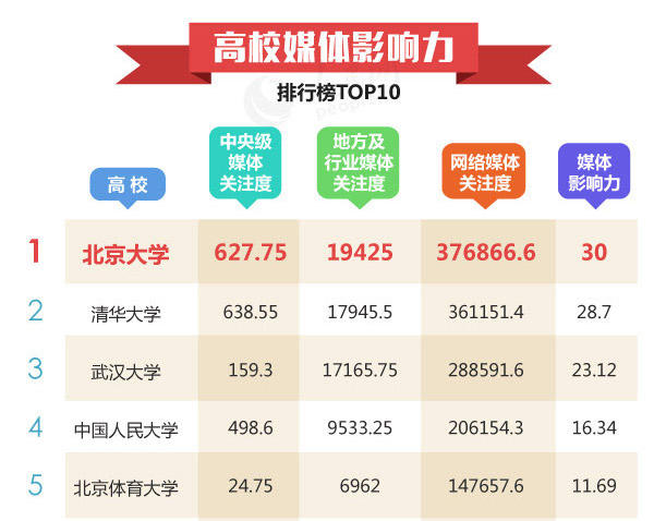 通過數據分析后,北京大學、清華大學、武漢大學、浙江大學、復旦大學、上海交通大學、中南大學、中國人民大學南京大學、四川大學分別位居中國高校社會影響力排行榜的前十名。