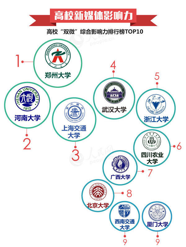 在“高校新媒體影響力”上,鄭州大學、河南大學、上海交通大學位居前三。而在“高校網絡輿論影響力”上,前三名則是北京大學、清華大學、武漢大學等高校。