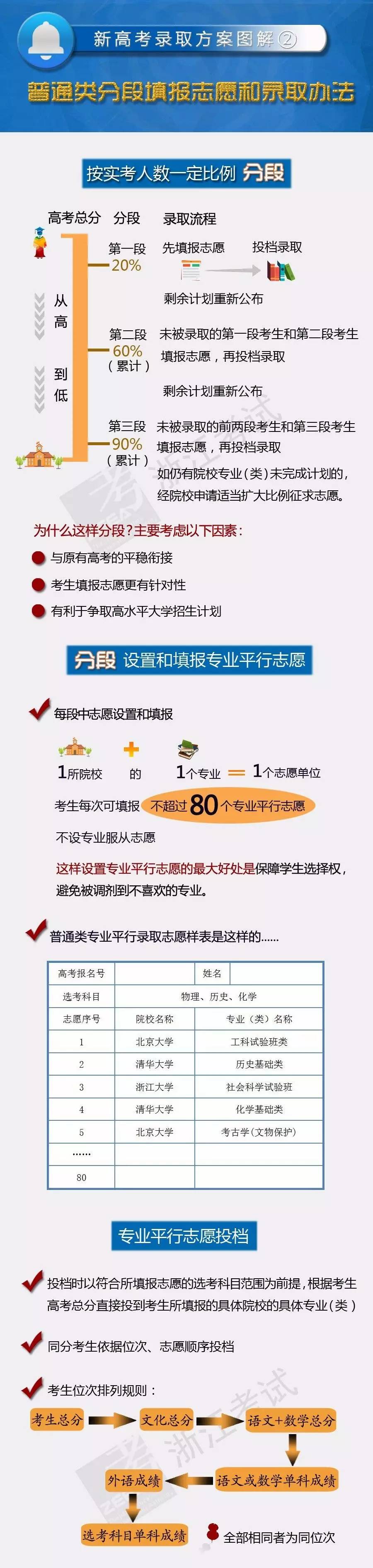 作為高考綜合改革在錄取環節的進一步細化,浙江省新高考招生錄取方案出臺啦!從2017年起,浙江省普通高校招生不分批次,實行分段填報志愿、專業平行投檔錄取。那么,新的招生錄取方案依據哪些原則制定,具體是怎樣的?一起來聚焦。
