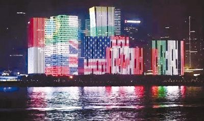 錢塘江兩岸建筑上的G20杭州峰會各國國旗燈光秀。