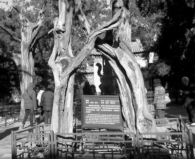 在“連理柏”上還有一絕妙景觀:從樹的北邊看,樹上西側的一個大枝,其扭曲處很像一只猴頭。這棵連理柏是乾隆皇帝受意所植,其雙柏的連理也是經人工整形而致。而有趣的是,在天一門正南的大銅鼎前,也有兩棵古柏,它們相對傾斜向上的兩個大枯枝遠看仿佛相交,不過近看其實并未相交。另外,在故宮東部的景福宮里,南北兩個月亮門前各有一棵清乾隆年間的“連理柏”,這兩棵“連理柏”分別和月亮門融為一體,成為獨特的景觀。