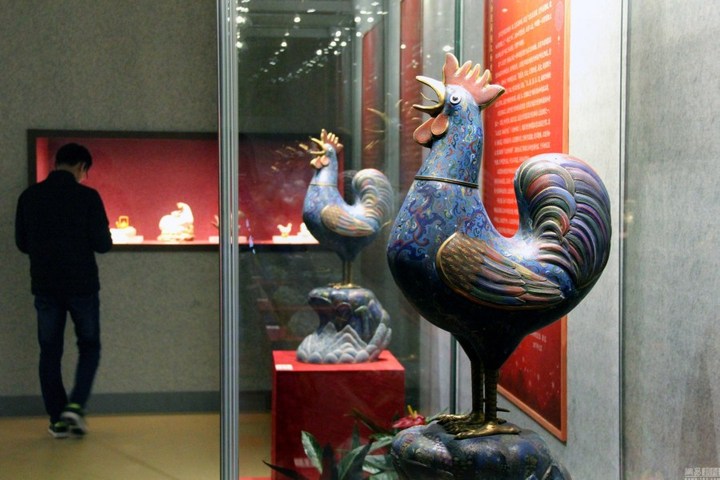 2017年1月7日,南京博物院"院藏雞文物展"現場,民國時期"雄雞報曉,四海升平"景泰藍雄雞銅擺件吸引觀眾。