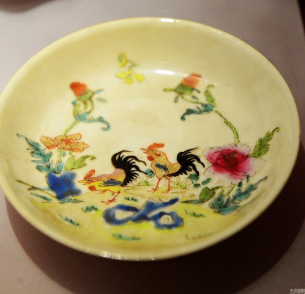 2017年1月8日,南京博物院,"錦繡雞"院藏雞文物展展品;清雍正年間白地粉彩雄雞花卉瓷盤。