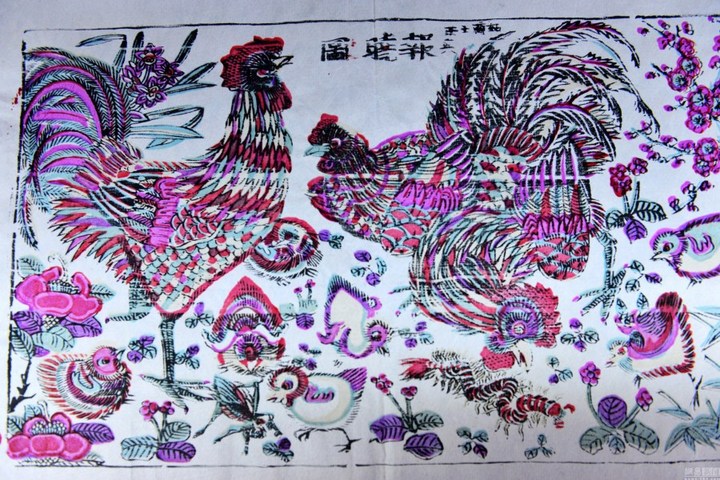 2017年1月8日,南京博物院,"錦繡雞"院藏雞文物展展品;清末民國初年木刻年畫金雞報曉圖。