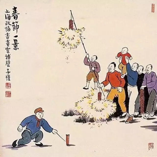 絕大多數(shù)人家二十七夜過年,所以這晚上商店都開門,直到后半夜送神后才關(guān)門。我們約伴出門散步,買花炮。花炮種類繁多,我們所買的,不是兩響頭的炮仗和噼劈啪啪的鞭炮,而是雪炮、流星、金轉(zhuǎn)銀盤、水老鼠、萬花筒等好看的花炮。其中,萬花筒最好看,然而價(jià)貴不易多得。買回去在天井里放,大可增加過年的喜氣。我把一串鞭炮拆散,一個(gè)一個(gè)地放,點(diǎn)著了火,立刻拿一個(gè)罐頭瓶來罩住,“咚”地一聲,連罐頭瓶也跳起來。我起初不敢拿在手里放,后來經(jīng)樂生哥哥教導(dǎo),竟敢拿在手里放了。兩指輕輕捏住鞭炮的末端,一點(diǎn)上火,立刻把頭旋向后面。漸漸老練了,即行若無事。