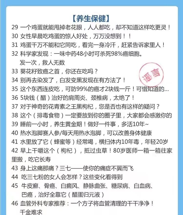 其次,健康是每個人都關心的“剛需”,人們普遍地擔心和焦慮自己的健康受到損害,也普遍地希望自己的身體健康得到維護和保養。所以,有簡單易行,既不需要勞心費神天天鍛煉,也不需要昂貴的保健品來滋補,只需要調整一下日常的飲食就有神奇的健康保健或者疾病治療效果的“方子”往往很受歡迎,很多養生保健類的謠言也因此流行,像《血管外科專家推薦:一個方子將血管清理的干干凈凈》,或者《口腔潰瘍一次治愈!(獼猴桃)太神奇了》。
