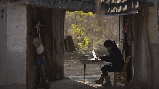 頭發(fā)潦草地挽在腦后,穿著一件極為普通的白色條紋T恤,暗紅色眼鏡框的下面,是不太自然的面部表情和留有風霜痕跡的皮膚——一個常見的農村婦女形象。