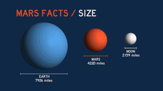 火星的直徑是4220英里(6792公里),為月球的兩倍。而地球的直徑又是它的兩倍左右。