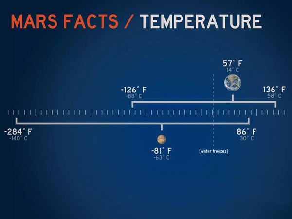 火星上的溫度最高可達到華氏70度(攝氏20度),或者低至約-225華氏度(攝氏-153度)。晝夜季節交替使火星表面溫差極大?;鹦潜鹊厍蚝洌驗樗h離太陽。