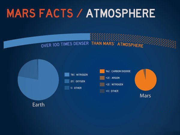 深呼吸,你覺得你吸進了什么?大部分是氮氣,約五分之一是氧氣,剩下是其它氣體的混合物。在火星上如果想得到在地球上一次呼吸相同的氧氣量,你必須吸氣14500次!火星的大氣密度比地球的小100倍,并且主要成分是二氧化碳,沒有這么多氧氣提供呼吸。