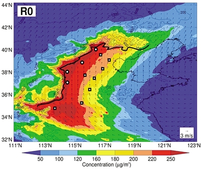 在南風條件下,可造成北京地區的嚴重霾污染。而在北風條件下即冷空氣來臨時,污染物得到清除,北京地區的PM2.5濃度迅速減少到30微克/立方米以下,形成從重霾到藍天的快速轉換。