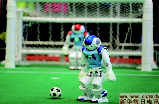 圖為4月2日,參賽機器人在比賽中控球。當日,2017機器人世界杯中國賽在山東省日照市舉行,此次比賽共設置了30個比賽項目,吸引來自全國418支參賽隊、近2000人參賽。新華社發(張磊 攝)