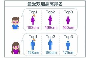 受訪的單身男女性還給出了他們最期望的身高區(qū)間,其中,178cm、180cm和175cm的男性最受女性歡迎,而男性則對身高163cm、168cm和160cm的女性更偏好。